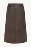 Midi-nederdel i 100% lammeskind med glat finish og blødt polyesterfor for komfort. Designet i en lige silhuet med elastisk linning for fleksibel pasform. Det minimalistiske design gør den nem at style – brug den med strik for et afslappet look eller pift den op med en bluse og støvler til et sofistikeret aftenoutfit.