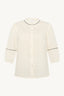 A soft and breathable blouse crafted from a natural blend of 70% cotton, 15% linen, and 15% polyester. Designed in a regular fit, it features delicate black trim details along the neckline and sleeves, adding a refined contrast to the light fabric. The blouse has 3/4-length sleeves and a button-down front for a timeless, versatile look, perfect for both casual and dressed-up occasions.
